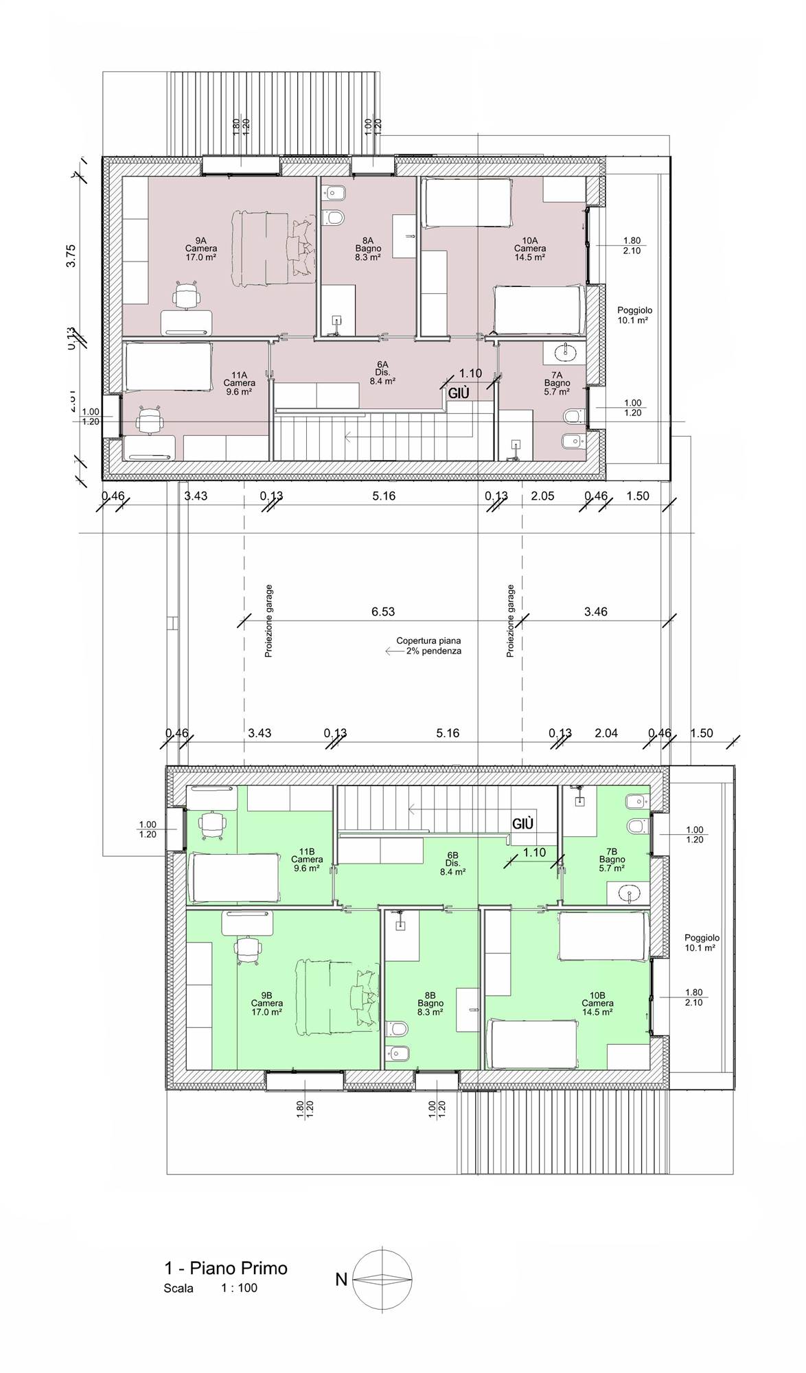 Zona notte con tre camere da letto , due bagni.