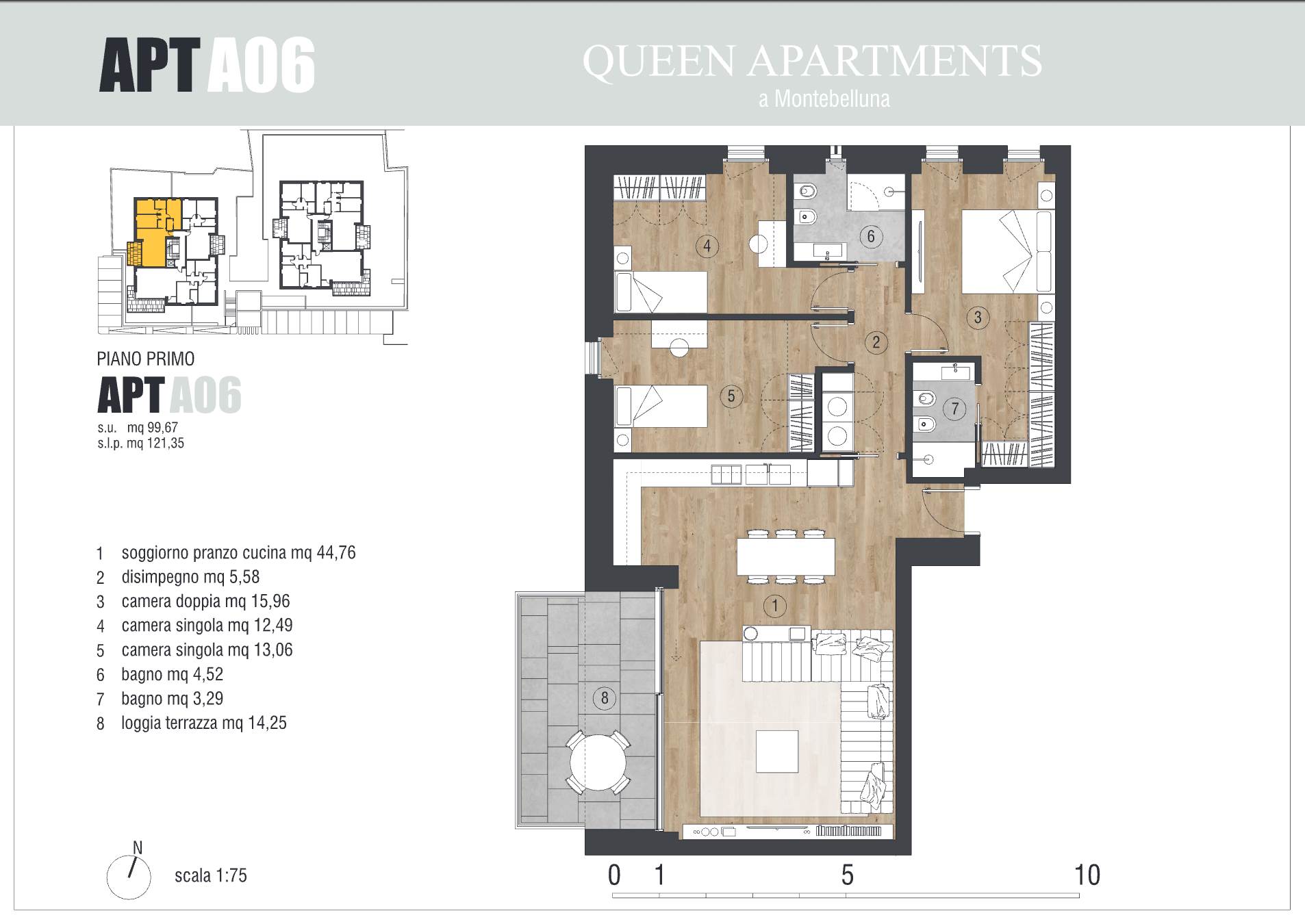 Si tratta di una appartamento al piano primo con tre camere, due bagni, e terrazzo.