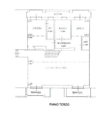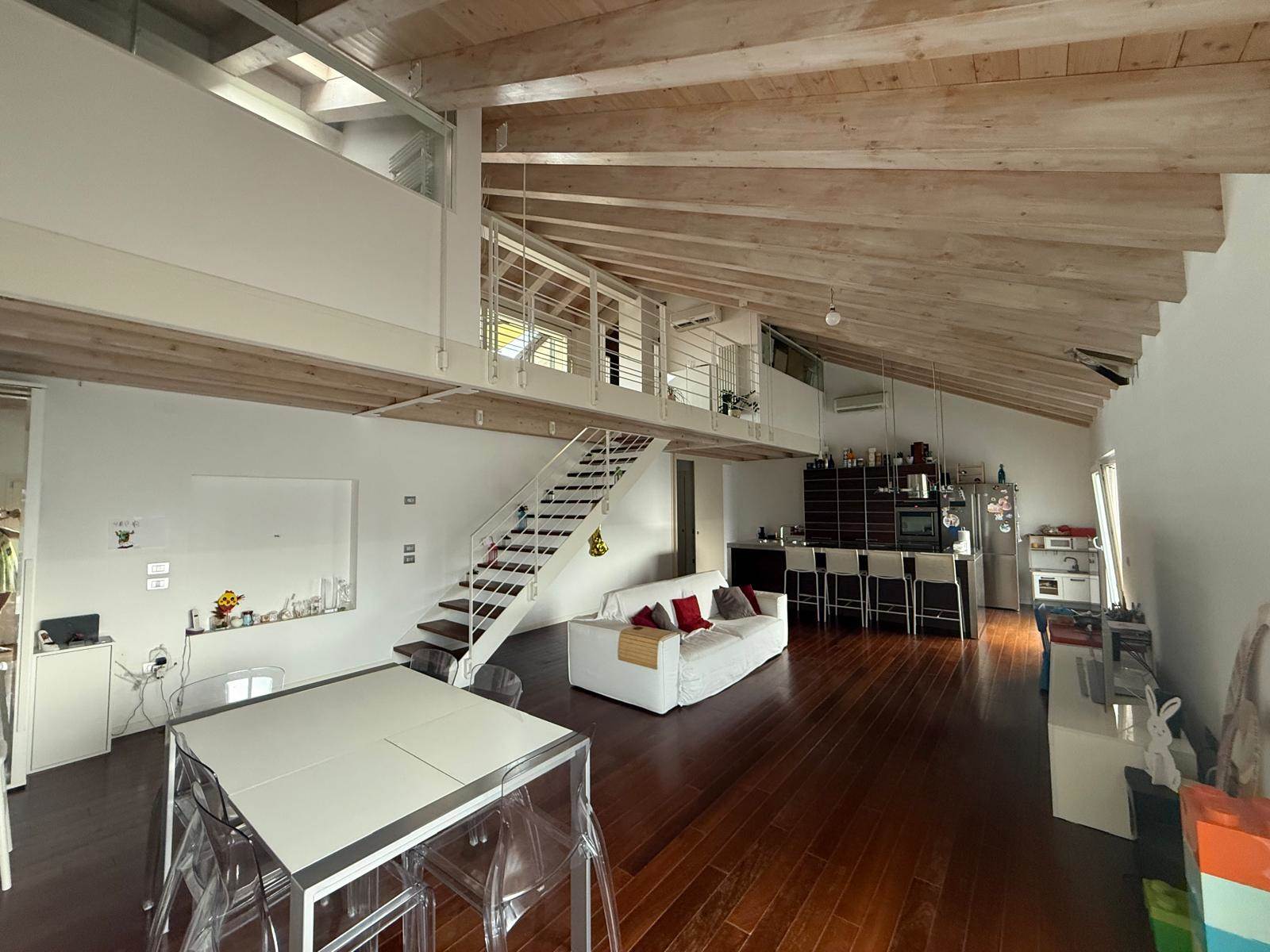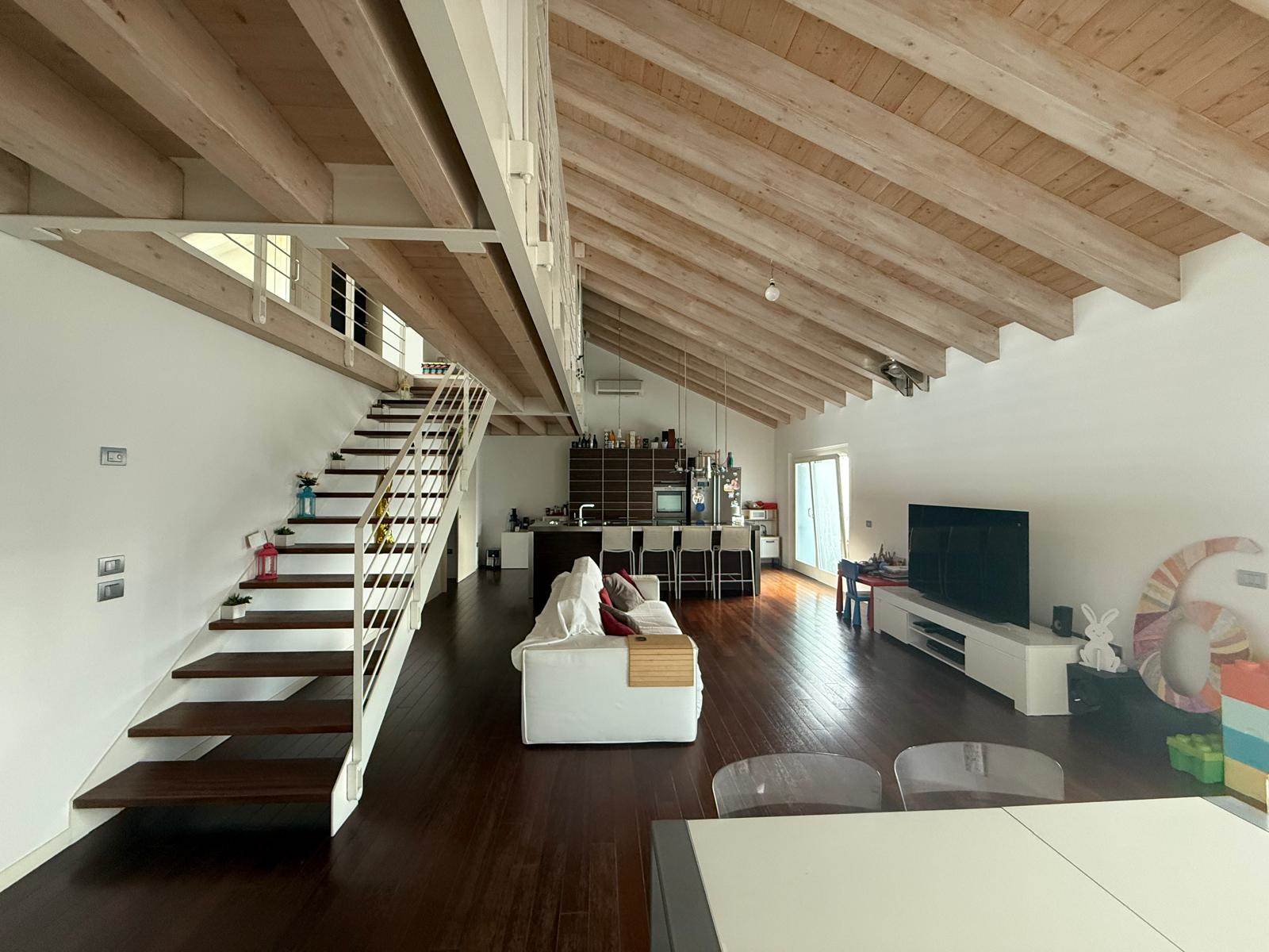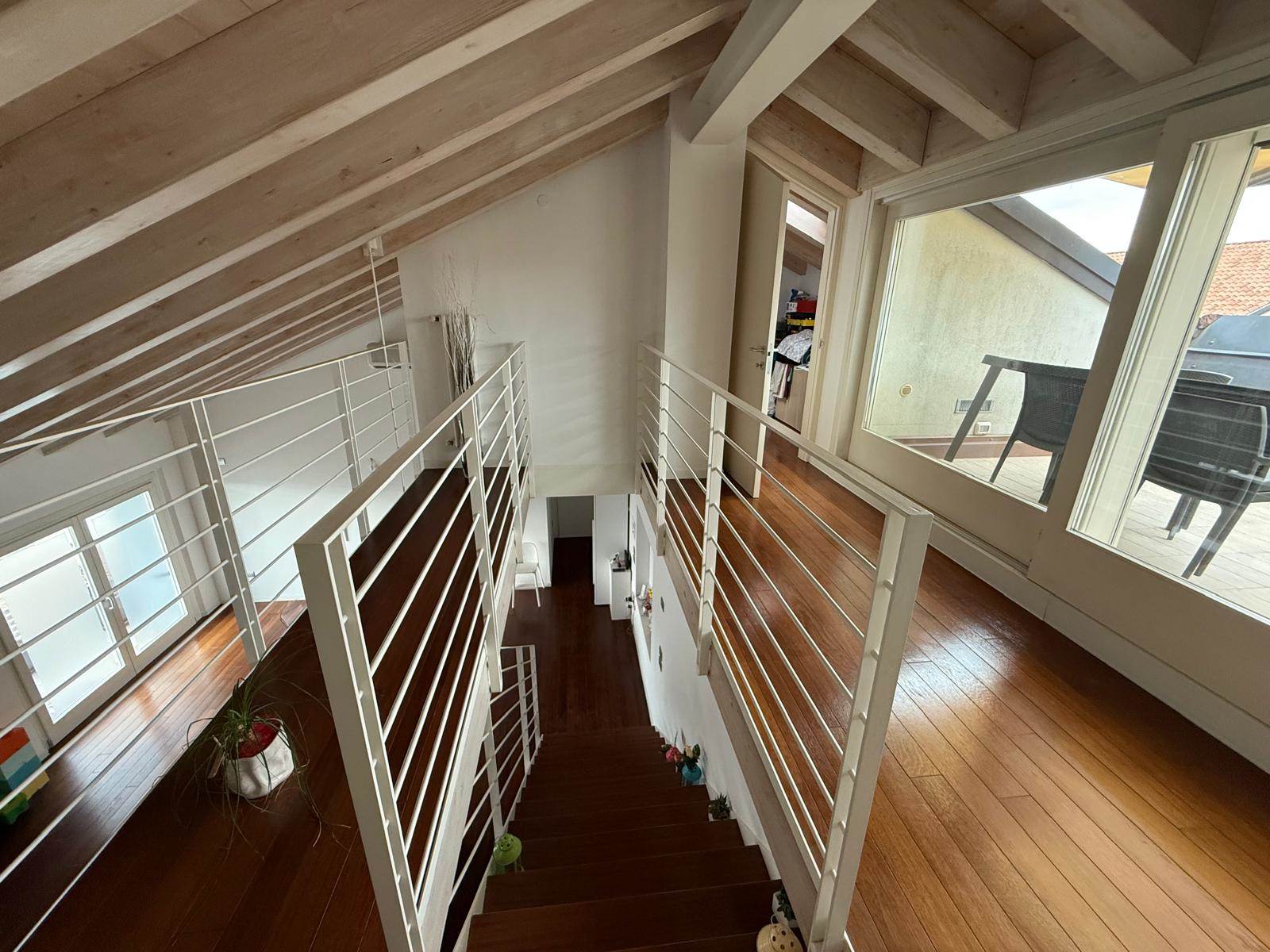 Una scala interna conduce al piano superiore, dove si sviluppa un ampio soppalco con affaccio sulla zona giorno, ideale come zona studio o living aggiuntivo. A questo livello si trovano anche un’ulteriore camera, un pratico ripostiglio, un bagno completo e un secondo grande terrazzo panoramico, ideale come solarium o zona relax.