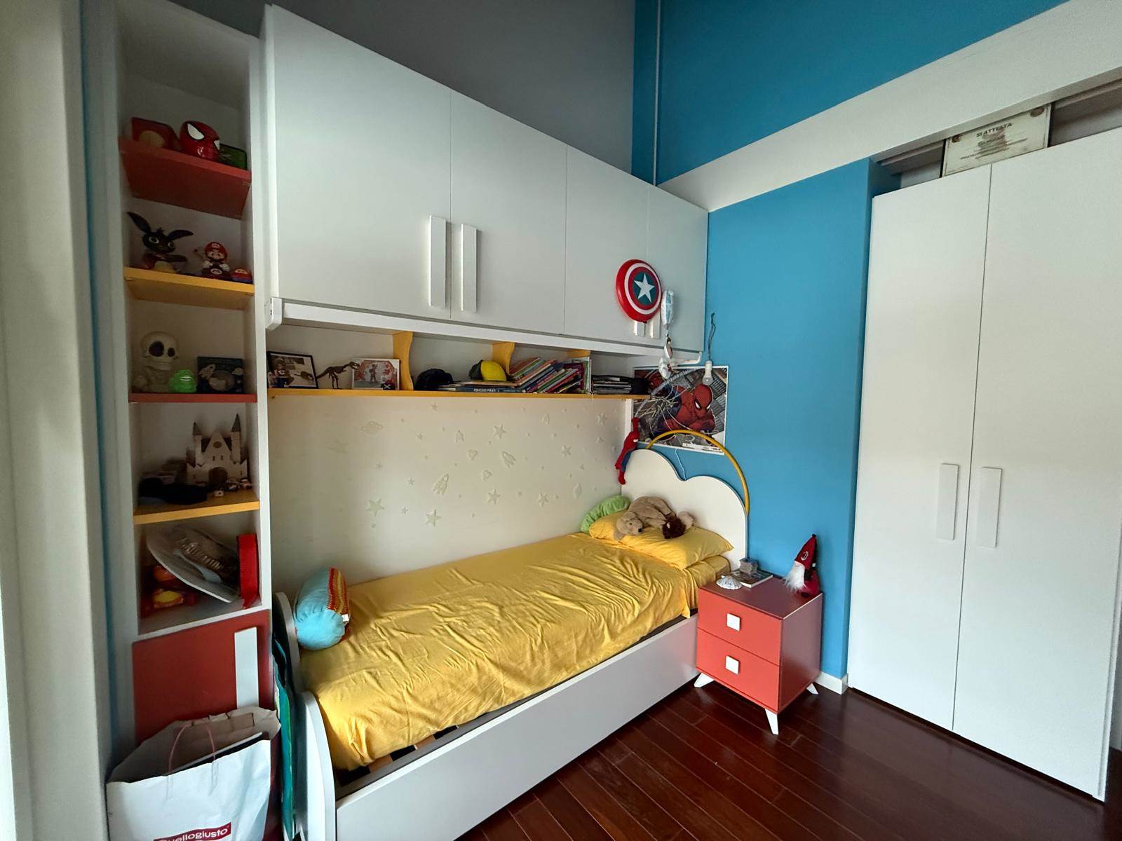 L’ingresso si apre su una luminosa e spaziosa zona giorno con cucina a vista, che si affaccia su due terrazzi. Sullo stesso livello troviamo una comoda lavanderia, una cameretta e una camera matrimoniale con cabina armadio entrambe servite da un terrazzo e un bagno finestrato.